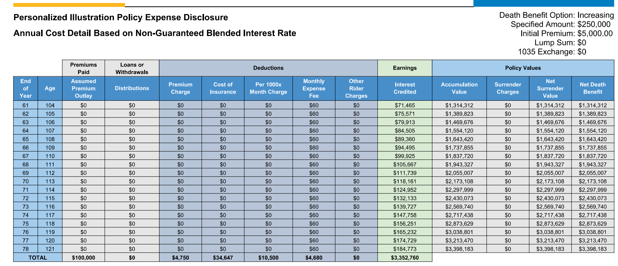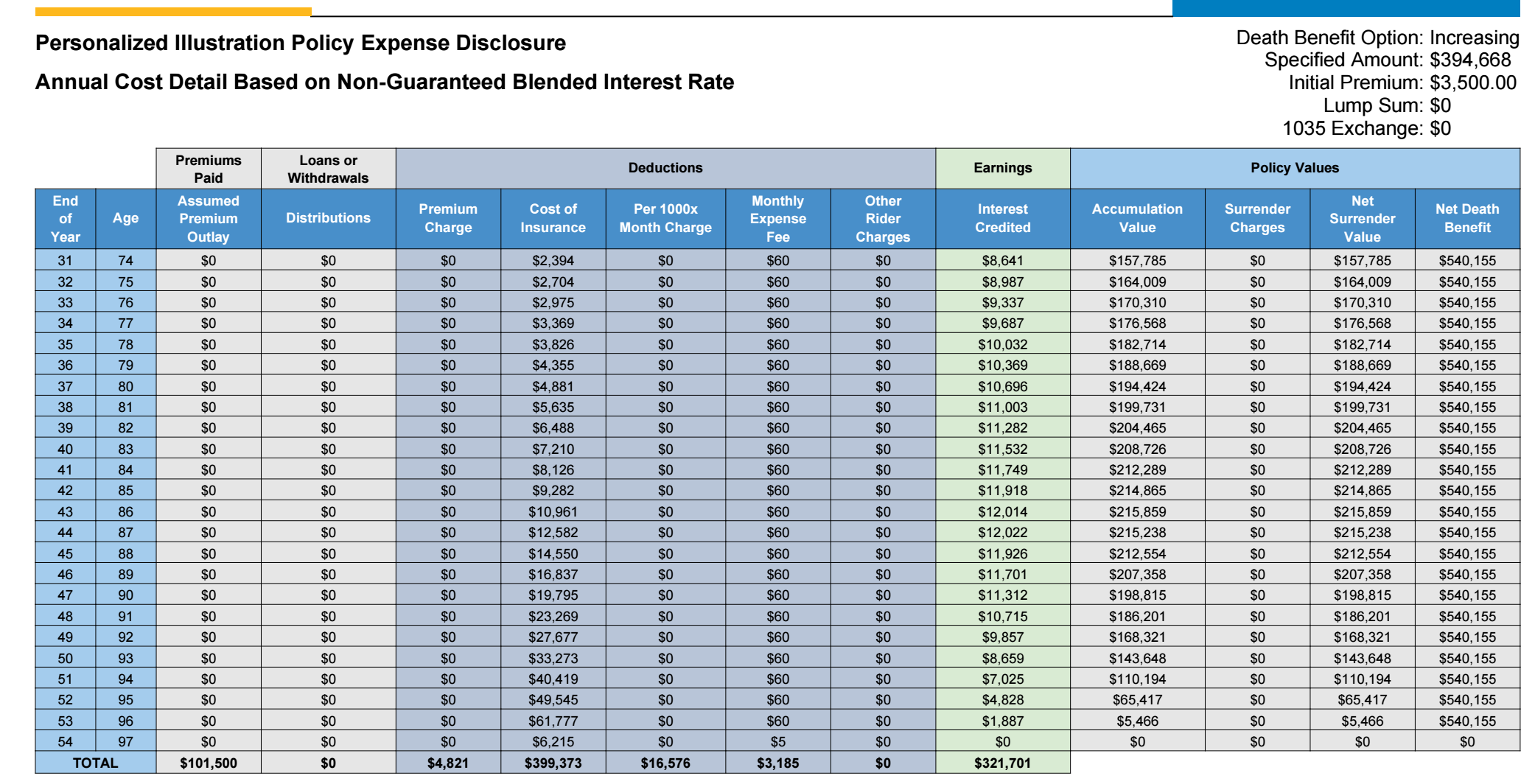 The premium paid isn’t high enough in relation to the death benefit to support building cash value and the policy will lapse by age 96 with no cash value.