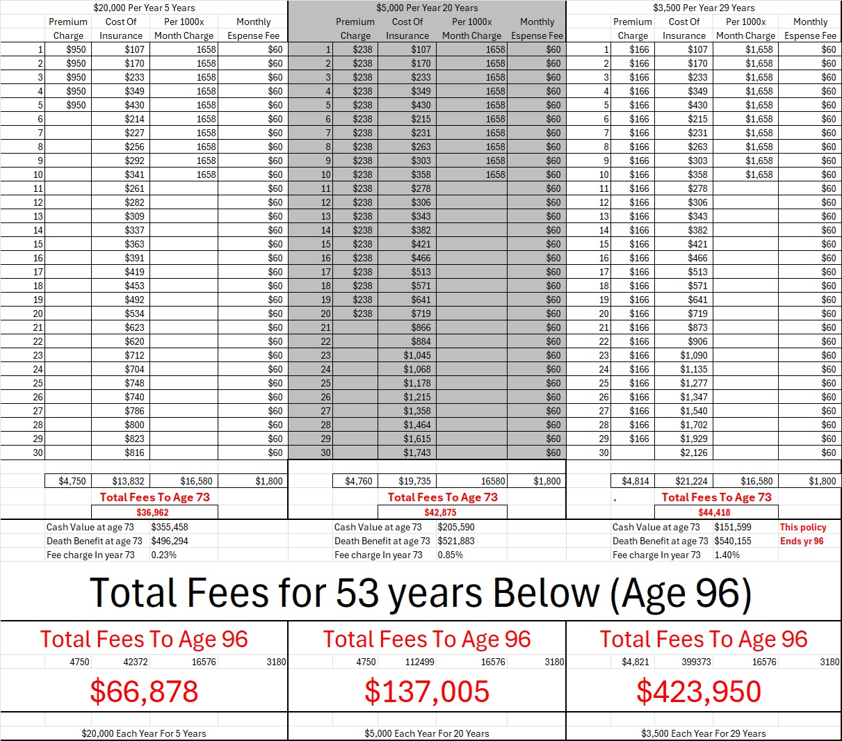 If you are comparing a cash value policy design such as option 3 above…. Then Absolutely Yes, the fees are ridiculously high with the option 3 design from above however, if the fee comparison is with a purposely properly structured policy as with option 1 from above the fees are drastically lower.